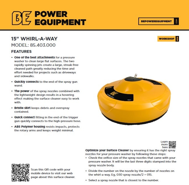 BE Power Equipment Whirl-A-Way 15" Surface Cleaner (4000 PSI 180°F)