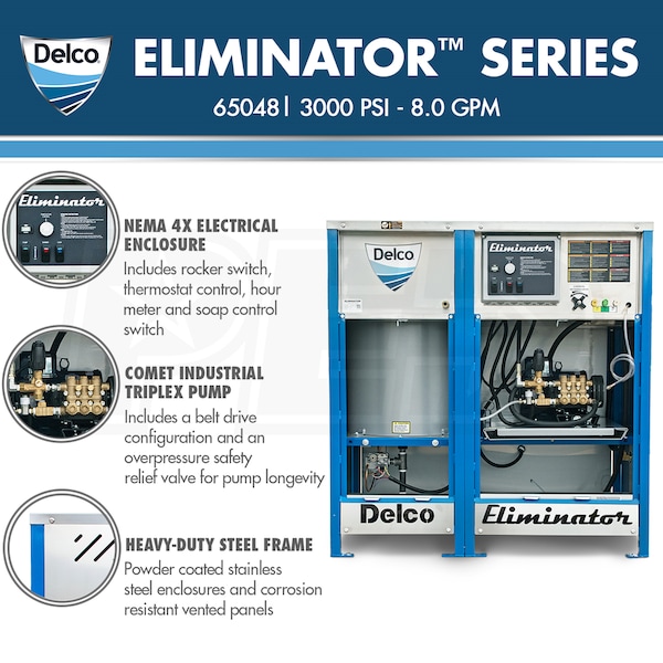 Delco Eliminator 3000 PSI - 8 GPM (Natural Gas - Hot Water) Stationary Pressure Washer w/ Comet Pump (230V 3-Phase)