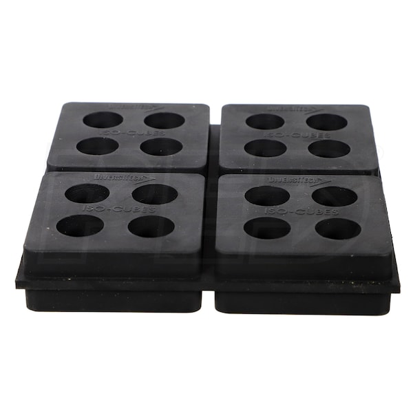 The Diversitech ISO-4 Iso-Cube is a natural rubber pad that reduces vibration and noise from refrigeration and AC equipment. It has a circular design that creates a suction cup effect, eliminating the need for bolts. These fifty durometer pads can withstand loads up to 180 PSI with greater resiliency and can be split into four 2 x 2 inch segments.