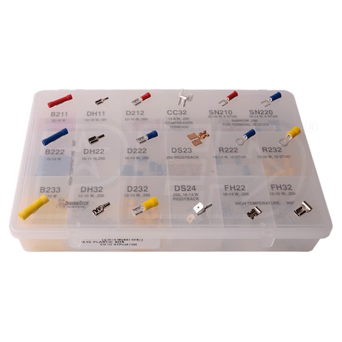- Contains 18 compartments with various popular terminals, including hi temp and compressor terminals.