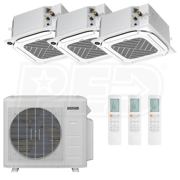 Durastar Ceiling Cassette Mini Split Heat Pump System - 3-Zone - 36k BTU Outdoor - 9k+9k+12k Indoor - 23.1 SEER2 - R-454B