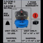 - 2.5 CFM @ 40 PSI; 3.8 CFM @ 90 PSI; 150 PSI Max