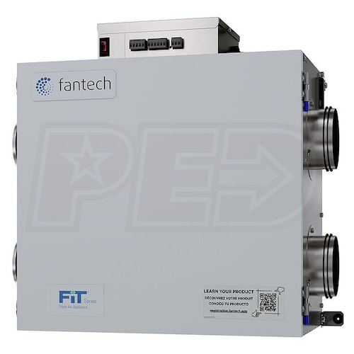 The Fantech FIT70E Energy Recovery Ventilator (ERV) has a slim profile, 4" side port connection, energy recovery core, supply fan modulation for frost prevention, and more. This 70-cfm appliance is ideally suited for condominiums and apartments. The FIT70E brings a continuous supply of fresh air into the premises while exhausting an equal amount of contaminated air out. The energy recovery core transfers both heat and moisture from the outgoing exhaust air to the incoming fresh air reducing the energy required to condition it. In summertime, the appliance cools and removes humidity from the fresh air and in wintertime, it heats it while retaining humidity to keep the living area comfortable year-round.