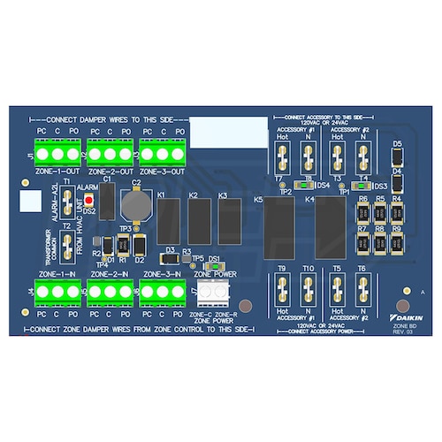 The A2L Accessory/Zoning Control is intended for R-32 refrigerant HVAC systems with electronic accessories like zoning controls, air cleaners, UV lamps, humidifiers, or dehumidifiers. It's not necessary if no such accessories are used. These systems require a refrigerant detection system for leak detection. If a leak occurs in the indoor unit, the detection system will shut down all HVAC functions and keep the indoor blower running to disperse R-32 gas. The A2L Accessory/Zoning Control works with this system to ensure all zone dampers remain open and installed accessories are powered down during a leak alarm. Once the leak is resolved, it will restore power to the accessories and close the dampers.