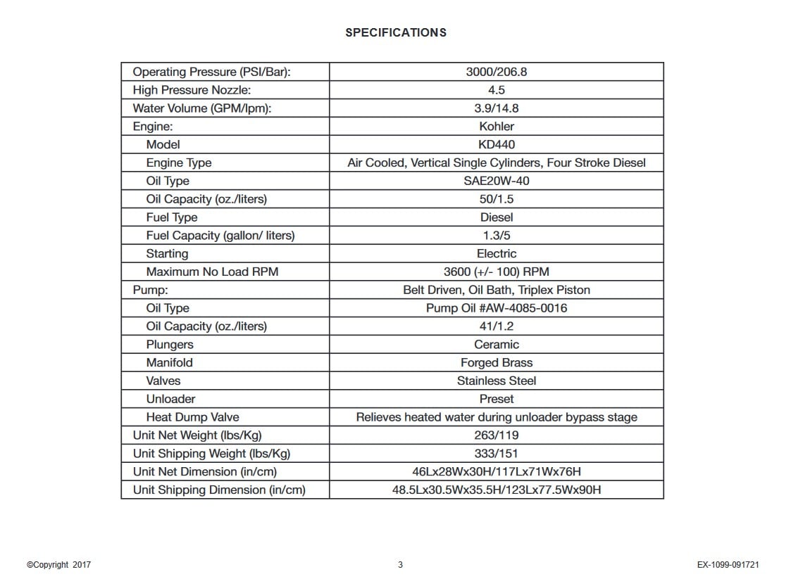 Mi-T-M CW Premium Professional 3000 PSI (Diesel - Cold Water) Belt-Drive Pressure Washer w/ General Pump & Electric Start Kohler Diesel Engine