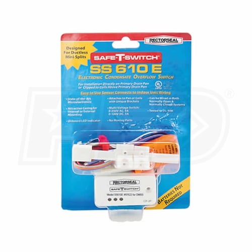 The SS610E Safe-T-Switch is specifically designed for use in mini split systems. Its small design allows it to fit easily inside any unit, drain pan, or clipped directly to coils. The external CPU casing can be mounted directly on the side of the unit. The SS610E continuously samples for water and will automatically shut down the system if water is detected in the unit. The built-in LED lights let you know the system is operating properly at a glance. In the event of a shut down, the unit will automatically restart once the water has subsided.