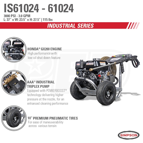 Simpson IS61024 Industrial Series 3000 PSI (Gas - Cold Water) Pressure Washer w/ AAA Pump & Honda GX200 Engine