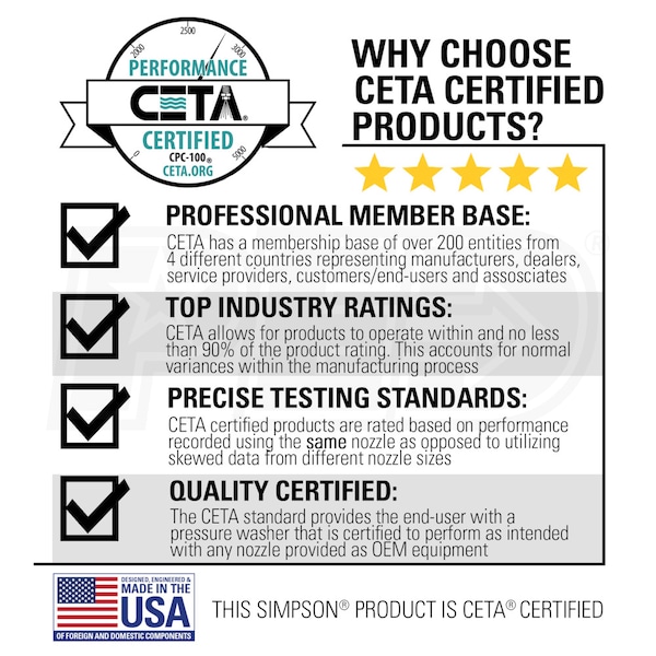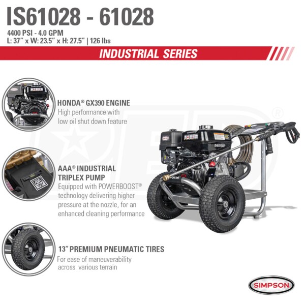 Simpson Industrial Series IS61028 4400 PSI (Gas - Cold Water) Pressure Washer w/ AAA Pump, Honda GX390 Engine, 20" Surface Cleaner & Extra 50' Hose