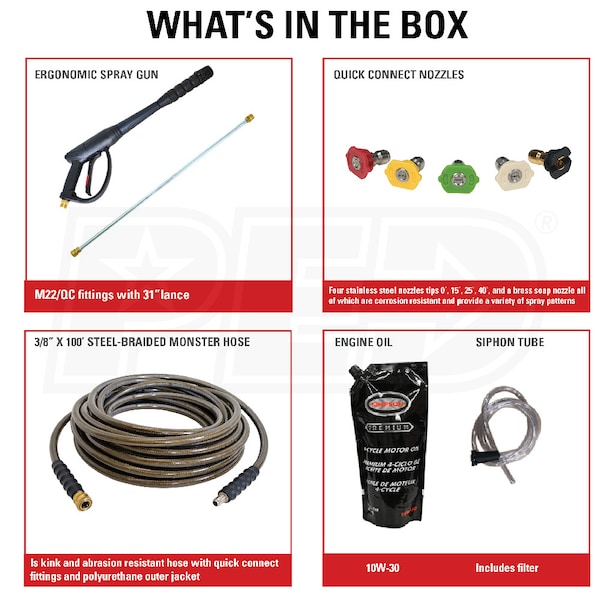 - Monster high-pressure hose is abrasion resistant w/quick connect
