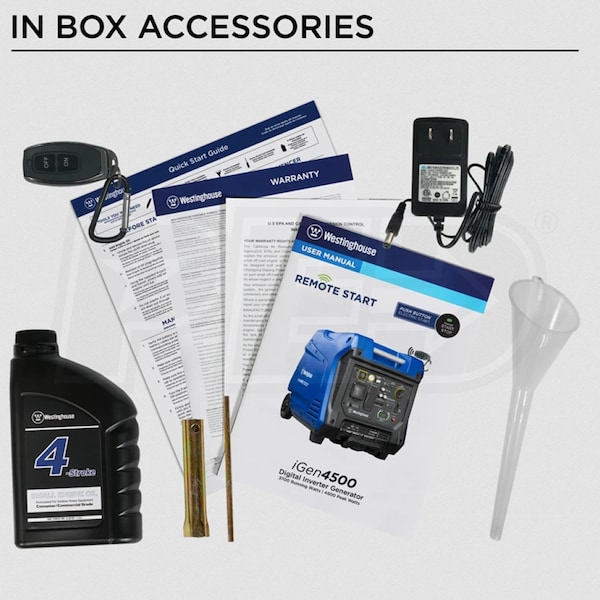 - Oil, Funnel, Tool Kit, Manual, and Quick Start Guide