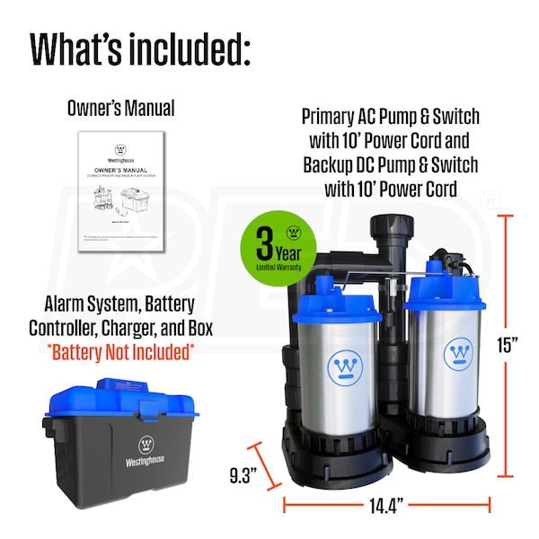 - Westinghouse 1/2 HP Combination Primary & Backup Sump Pump System
